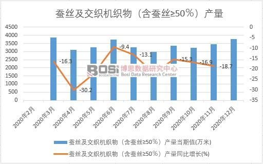 據(jù)博思數(shù)據(jù)發(fā)布的《2021-2027年中國(guó)蠶絲市場(chǎng)深度調(diào)研與投資前景研究報(bào)告》表明:2020年我國(guó)蠶絲及交織機(jī)織物(含蠶絲≥50%)產(chǎn)量累計(jì)值達(dá)38349.5萬(wàn)米,期末產(chǎn)量比上年累計(jì)下降18.3%。